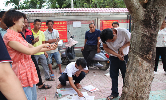 圖為保國(guó)分公司割膠技術(shù)員在樂(lè)東縣陳考村委會(huì)對(duì)膠農(nóng)割膠技術(shù)現(xiàn)場(chǎng)測(cè)試。